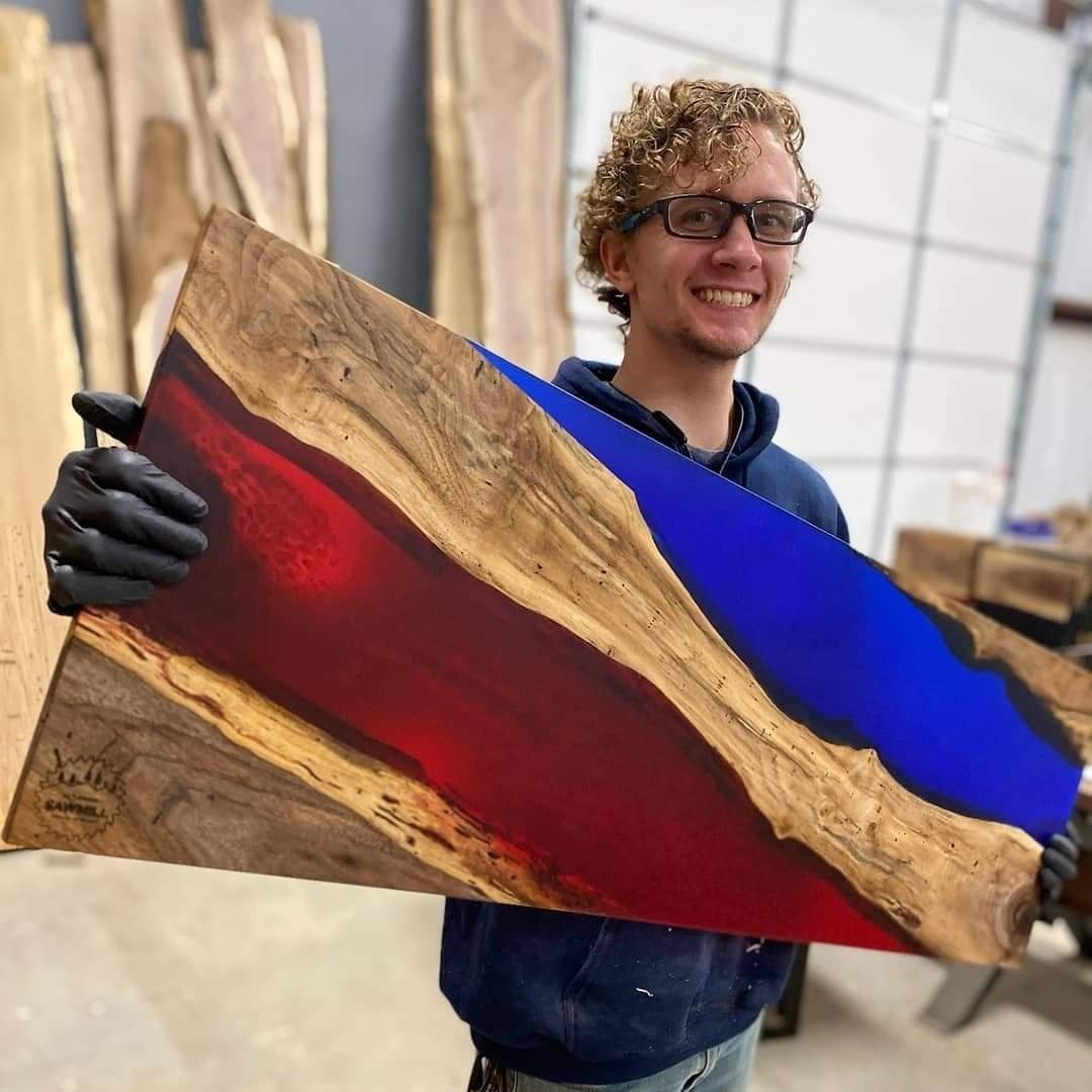 Jake started out as a manager at Walmart, and was just a hobbyist woodworker on the side, building tables for friends and family. He decided to take his bonus one year and buy a sawmill so he could learn how to mill his own lumber, but quickly found out he could make more money milling lumber for other people than he was at Walmart! This inspired him to quit his job and start milling full time, and since then he has quickly grown his company into what it is today. He now has his own line of epoxy resin, with dozens of distributors all across the United States and Canada!